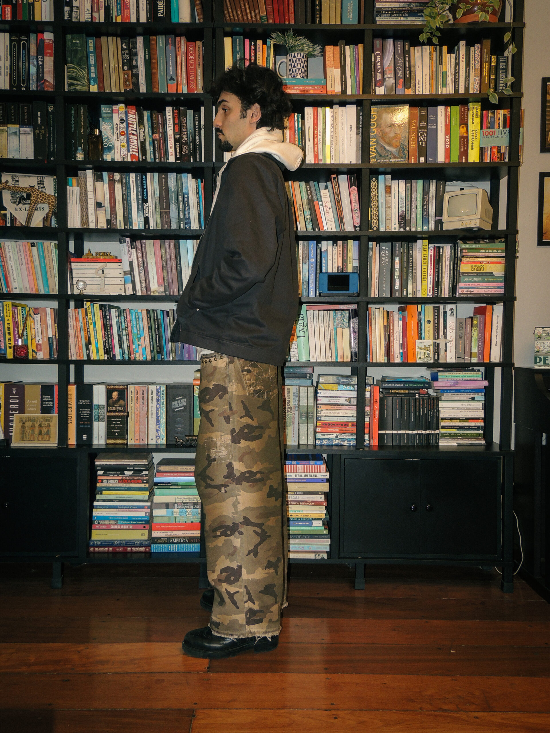 Jaqueta de alta gramatura confeccionada em sarja 100% algodão. Zíper de metal e rebites metálicos na região do bolso. Estampa em silk reativa tom sobre tom. Modelagem boxy.