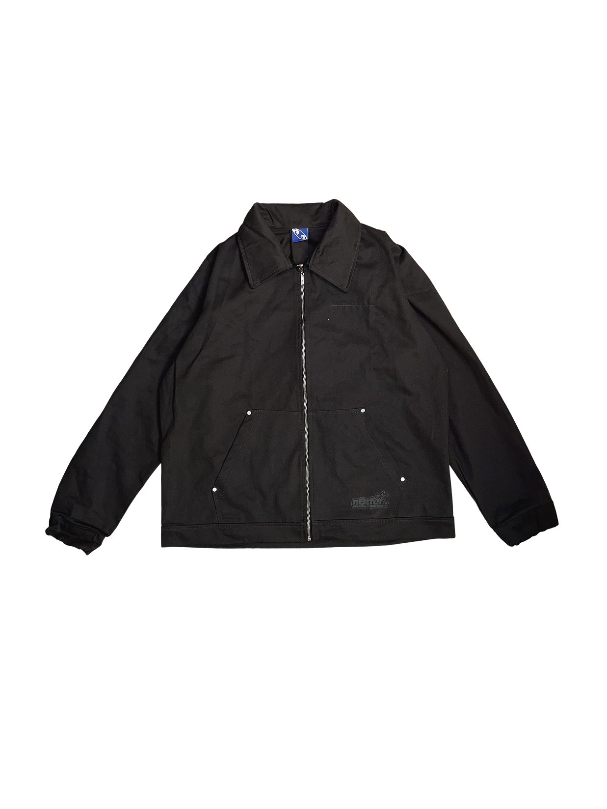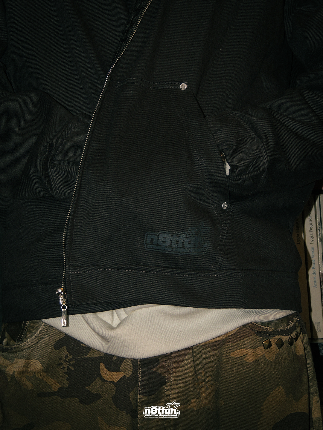 Jaqueta de alta gramatura confeccionada em sarja 100% algodão. Zíper de metal e rebites metálicos na região do bolso. Estampa em silk reativa tom sobre tom. Modelagem boxy