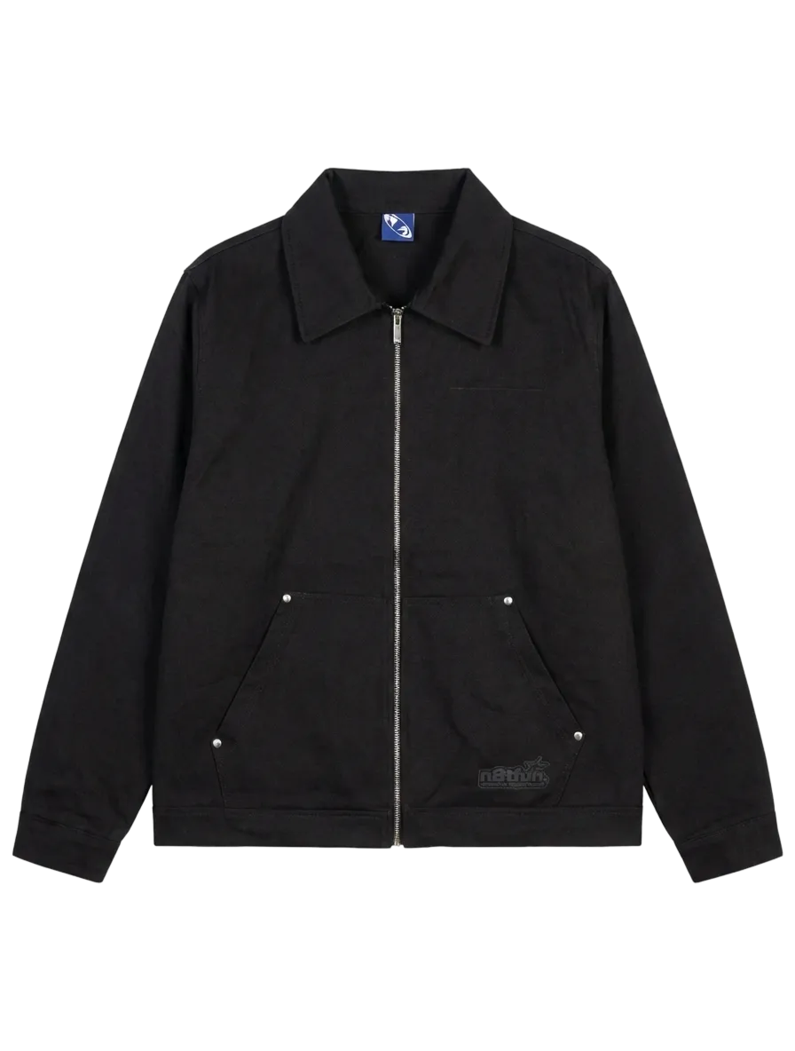 Jaqueta de alta gramatura confeccionada em sarja 100% algodão. Zíper de metal e rebites metálicos na região do bolso. Estampa em silk reativa tom sobre tom. Modelagem boxy.